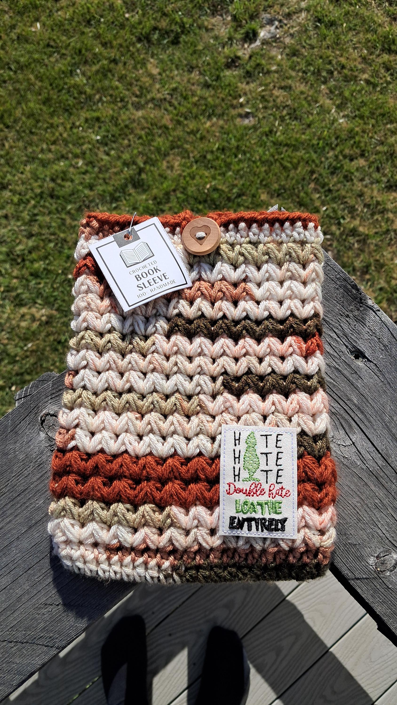 Handmade crochet book Sleeve. Made from acrylic yarn. Embroidered patch is hot glued on.