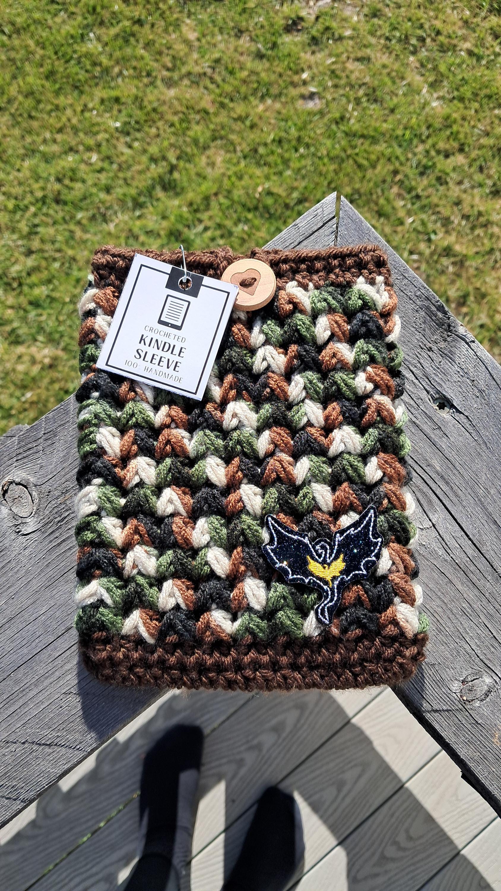 Handmade crochet book Sleeve. Made from acrylic yarn. Embroidered patch is hot glued on.