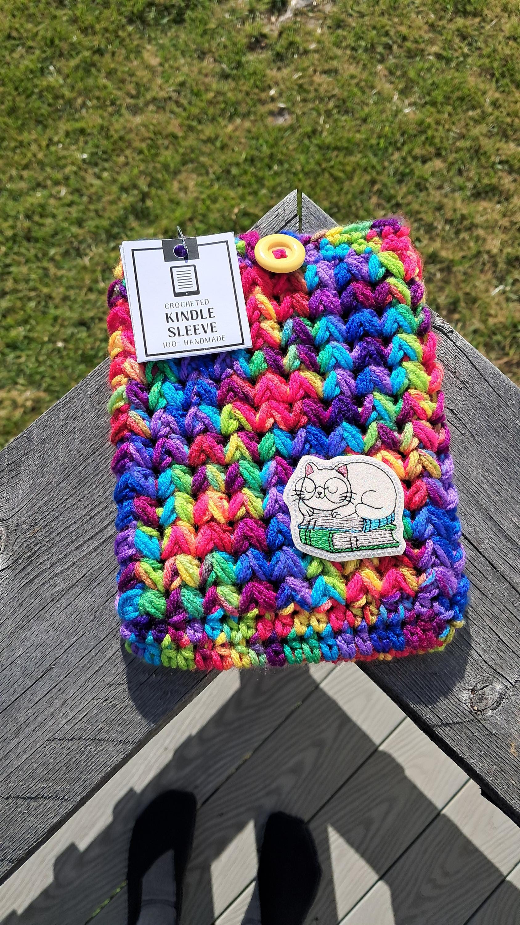 Handmade crochet book Sleeve. Made from acrylic yarn. Embroidered patch is hot glued on.