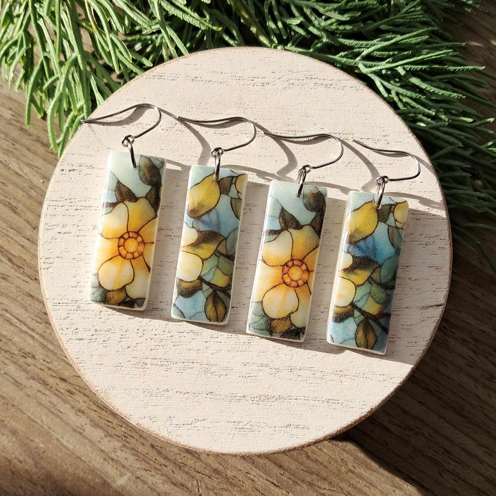 Blue Floral Stained Glass Earrings: Rectangle